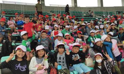 これからイルカショーの会場でお昼ご飯です。みんなとても嬉しそうです。