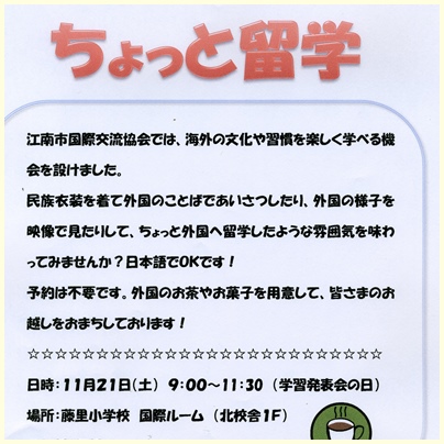 11月21日(土)学習発表会と同じ日に、藤里小学校 北館1階 国際ルームで行います。