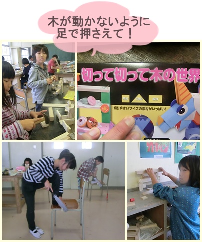 のこぎりを使って木を切っている子もいました。みんな、気をつけてやってくださいね。