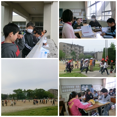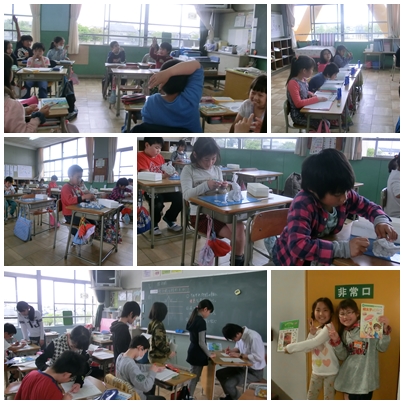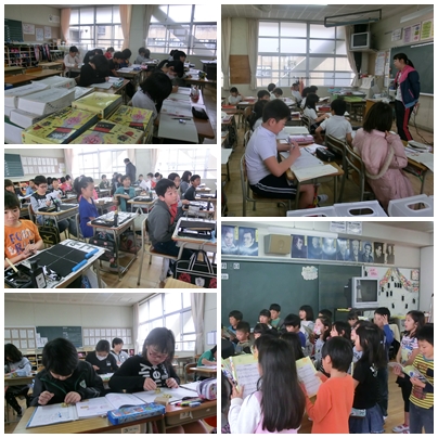 5年生理科は雲の動きを観察しています。前回は雲一つない快晴でしたが、今日はそらいっぱいに雲が広がり、さまざまな気づきがありました。3年生の音楽はピアノの前に集まり、大きな声で楽しそうに歌っていました。4年生では、図書館の使い方とともに、自分の興味ある本を探していました。5年生算数では、木のブロックを使って、体積の概念を身につけました。6年生の算数では、課題を終えた児童がミニ先生となって、友達に教えていました。
