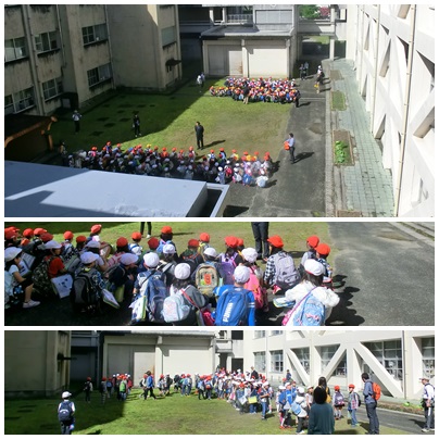 1〜4年生が校外学習に出かけました。延期して今日になりましたが、青空が広がるいい天気になりました。元気に「行ってきます」とあいさつをして出発しました。