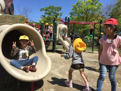4年生のお兄さんお姉さんと遊具で遊んだり広場で鬼ごっこやだるまさんが転んだをしたりしています!