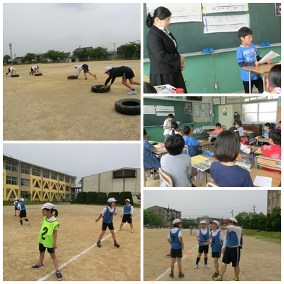 4年生の社会は校内の消火器・消火栓などの火事から身を守る設備を調べた報告会をしていました。体育では、リレーのバトン練習を何度も繰り返していました。
