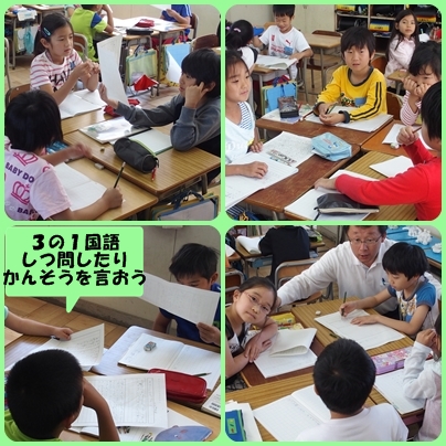 3の1は国語で『しつ問したり かんそうを言おう』の勉強をしています。班ごとに発表,質問・感想を言う練習をしています。