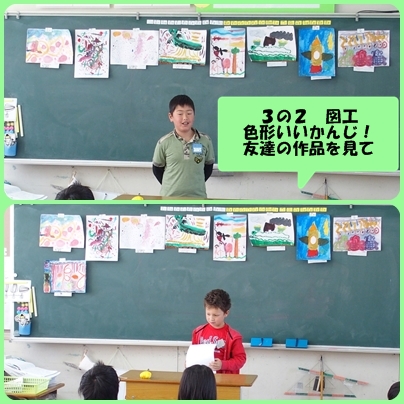 3の2は図工で『色・形いいかんじ!』の勉強をしています。今日は完成させた作品を発表し合い,お互いの作品のよさを見つける勉強をしています。