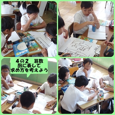 4の2は算数で,『図に表して,求め方を考えよう』の学習をしています。班ごとに話し合い,ホワイトボードに書いて発表の準備をしています。
