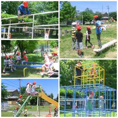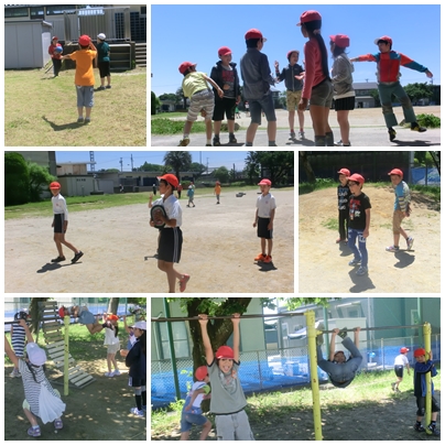 雲ひとつない快晴で、運動場もいい状態になり、たくさんの児童が外遊びを楽しんでいます。特に低学年の児童が多く、鉄棒やジャングルジムなど、体を支える遊びやシーソー、おにごっこなどで楽しんでいました。