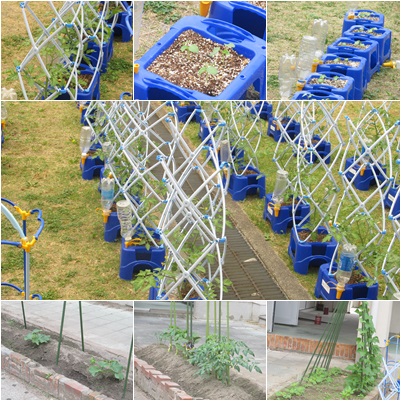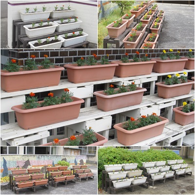 やっとマリーゴールドの植え替えを終了し、門などに並べることができました。中庭には、各学年で育てている植物でいっぱいです。