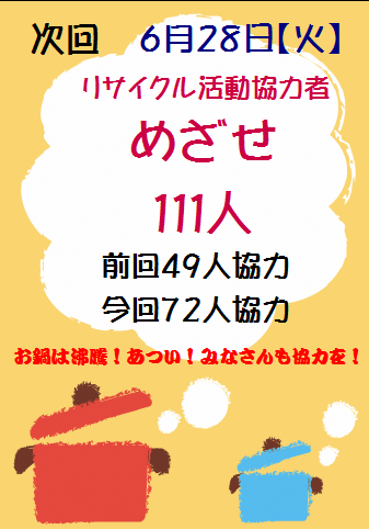 次回は、6月28日【火】に実施します。「めざせ、111人」を合い