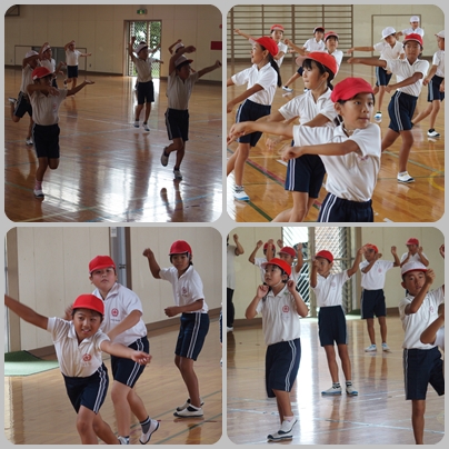 4年生が運動会の『よっちょれ』の練習をしています。映像を見ながらふりを覚えているところです。