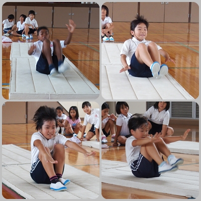 運動会練習の合間をぬって,今日はマット運動,前転・後転の練習をしました。