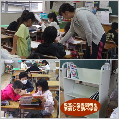 3年生 総合的な学習の時間『つながるいのち』の授業の様子です。図書資料を可動式書棚で教室に運び,調べ学習をしています。