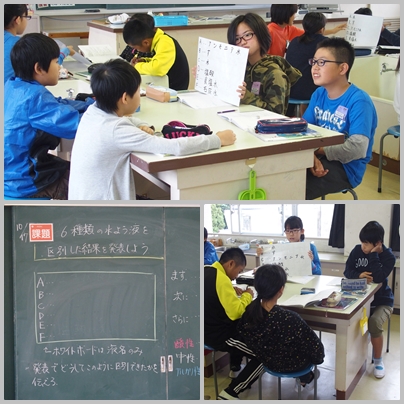 6年生 理科『6種類の水よう液を区別した結果を発表しよう』の授業の様子です。