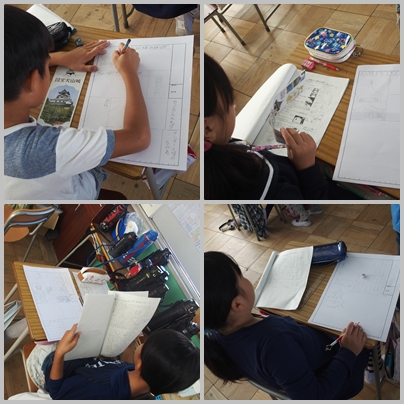 4年生は 秋の校外学習のまとめをしています。しおりやパンフレットを見ながら新聞にまとめています。