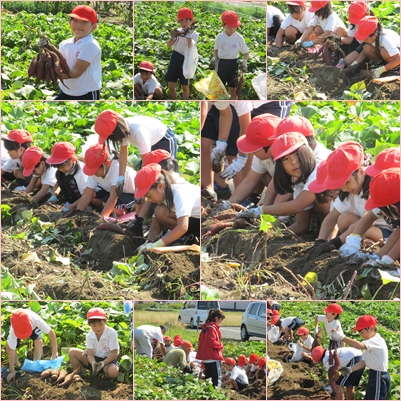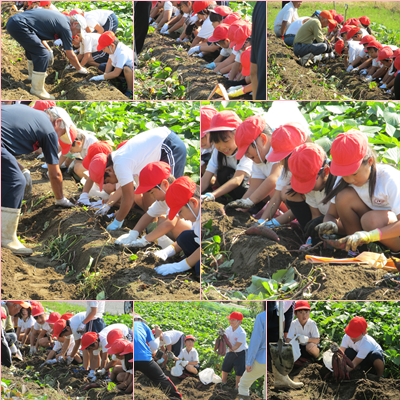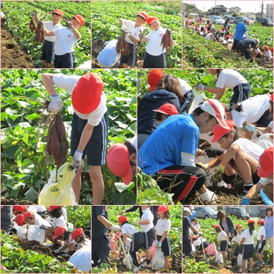 5月31日に植えつけたさつまいも(紅あずま)を掘りに、2年生が出かけました。神明地区の方に、いろいろなお話をしていただいた後に、実際に収穫に入りました。すごく楽しそうに作業していました。ここまでに至るにあたって、神明地区の皆様には、たいへんお世話になりました。ありがとうございました。