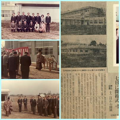 第1回の今回は、昭和44年の校舎と開校関連の行事です。上の写真は、開校当時の校舎(現在の北館)と西脱履です。下の写真は、開校関連行事に参加していた、当時の市教委関係職員と藤里小学校教職員です。開校当時はまだ、工事真っ最中だったのですね。
