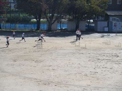 3年生 体育「ハードル走」の授業の様子です。運動場のぬかるみをさけて授業をしています。