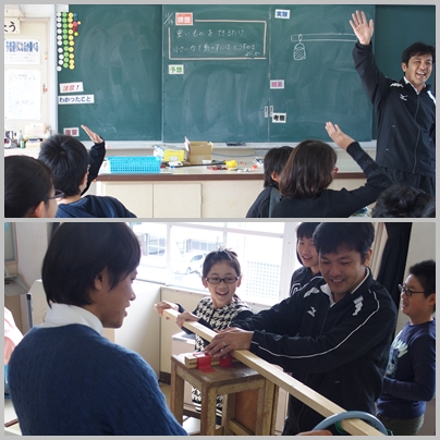 6年生 理科「重いものを できるだけ 小さい力で うごかすには どうしたらよいか」の実験の様子です。