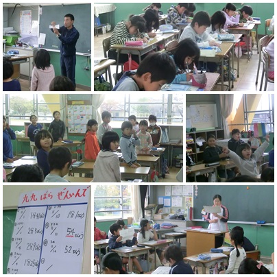 2年生は、九九の練習を毎日頑張っています。学級全員で一問ずつ答えるタイムトライアル。初めての時の半分以下の時間で達成できるようになりました。
