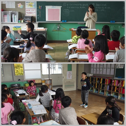 2年生 算数の授業の様子です。今日は九九の六の段を発表しています。みんなで応援したり拍手をしたりして,笑顔で勉強しています。