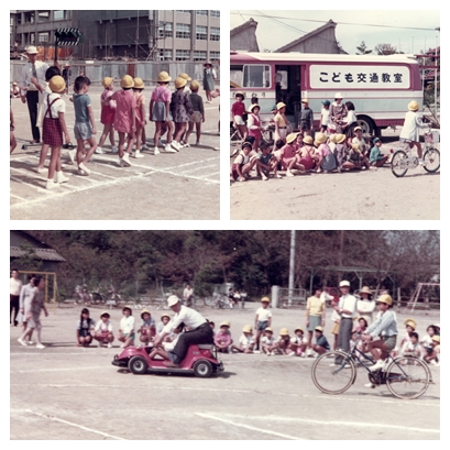 中段の写真は交通教室です。自動車が各家庭に普及したり、輸送にトラックが多く使われてくる反面、交通事故も多発し、交通事故死者数は、現在の約4倍以上でした。そのため、各学校で運動場を使った交通教室が頻繁に行われていました。横断歩道の渡り方から、自転車の乗り方まで指導をしていただきました。