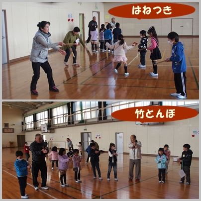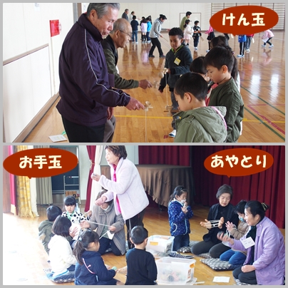 今日は,神明老人会の方々を講師に招き,1年生が『昔遊びの会』を開催しています。