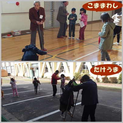 「あやとり」「お手玉」「けん玉」「はねつき」「竹とんぼ」「こま回し」「竹馬」にチャレンジしています。