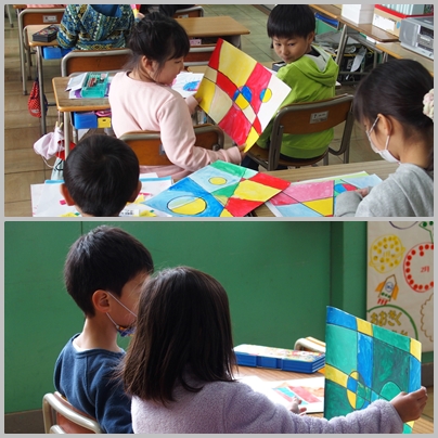 1年生 図工の授業の様子です。今日は,今まで取り組んできた作品をまとめています。お互いの作品を懐かしそうに見ています。
