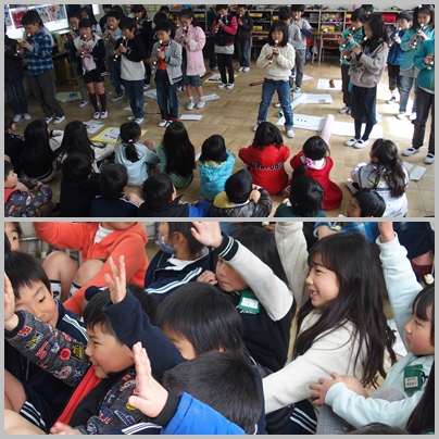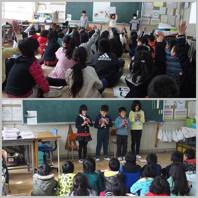 3年生 2年生を招いて,3年生の活動紹介をしています。「3年生なると…リコーダーがあって…」