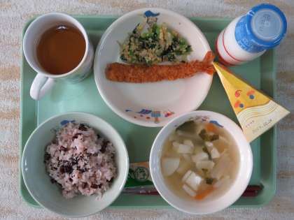 やまぶきあえ ゆばのお吸い物 おいわいケーキ