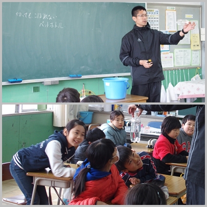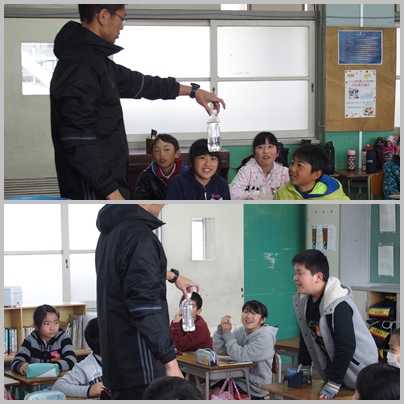 4年生 理科の授業の様子です。『切っても こぼれない ペットボトル』の実験です。