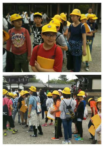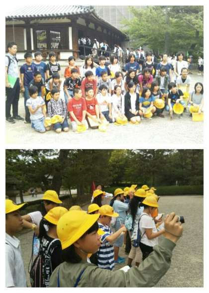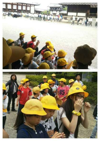 ガイドさんから説明を聞き、金堂や五重塔を見学しています。