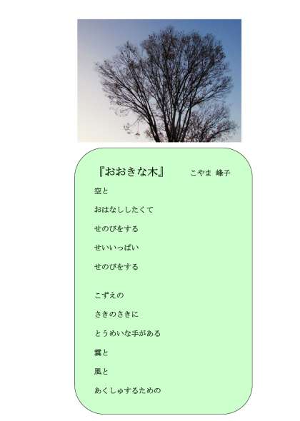 けやきのように上へ上へグングン伸びてもらいたい。そして、たくさんの枝葉を広げてもらいたい。