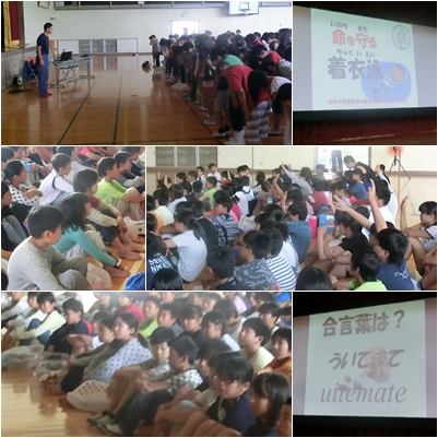 今日も朝から晴れていて、暑くなりそうです。5・6年生は、消防署の方に来ていただき、着衣泳を行います。1時間目は概要説明、2時間目は5年生が体験し、3時間目は6年生が体験します。その様子は後ほど紹介します。