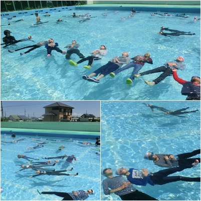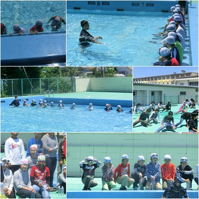 午前中に5・6年生は着衣泳を行いました。江南市消防署の方々の指導のもと、合い言葉は、「ういてまて」泳がず、しゃべらず、ただ浮いて助けを待つことが大切と聞きました。講習の最後には、3分間じっと浮いたままの状態を続けるチャレンジをしました。多くの児童がペットボトルの浮き道具なしで浮くことができました。