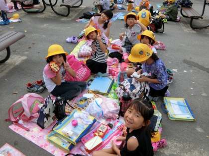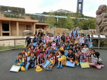 ゾウの前で,1年生全員で記念写真を撮りました。外で皆で食べたお弁当はとてもおいしかったね。