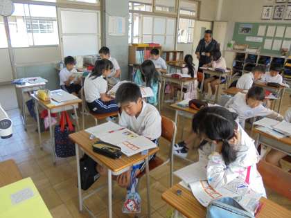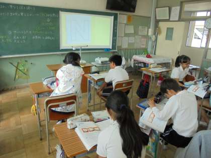これまで、線対称の図形を学習しました。今日は、点対称の図形がどのようなものなのかということをグループで話し合いました。180度回転すると重なる図形であるということを確認した後、対応する点と直線を確認し合いました。