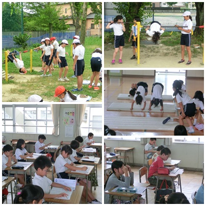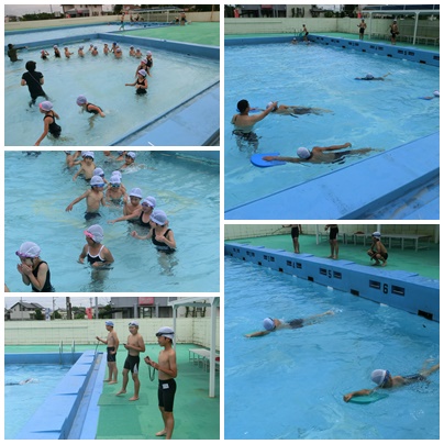 今日は雲は見られるものの晴れていて、プールに入ることもできます。1年生は、プールの中で歩いたり、潜ったりと水あそびを楽しみました。6年生は、クロールの練習を繰り返し行いました。