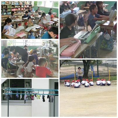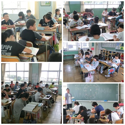 昨日とは一転し、曇り空です。まだ雨は降っていません。1年生は、鉄棒運動です。前回りや逆上がりの練習をしていました。6年生英語では、時刻のきき方、答え方の練習でした。英語の数の単語は覚えていても、とっさに時刻をきかれて、答えられるようにしていました。
