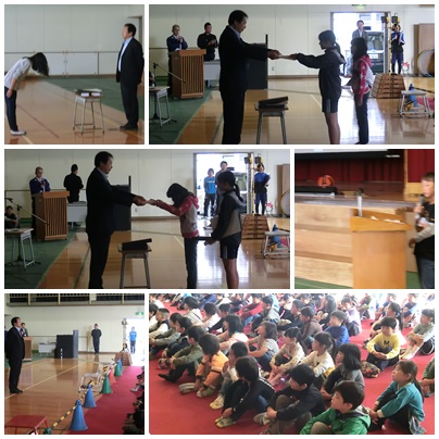 11月最初の朝礼でした。まず、江南市消防本部主催防火作品展のポスター部門で入賞した児童の表彰を行いました。