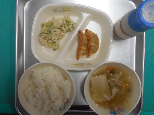 今日は世界の食料問題について考える世界食料デーです。現在でも、食べられるのに捨てられている食品は多くあります。今日は、そんな食材を活用した献立です。(藤の花給食センター「10月分献立表」より)