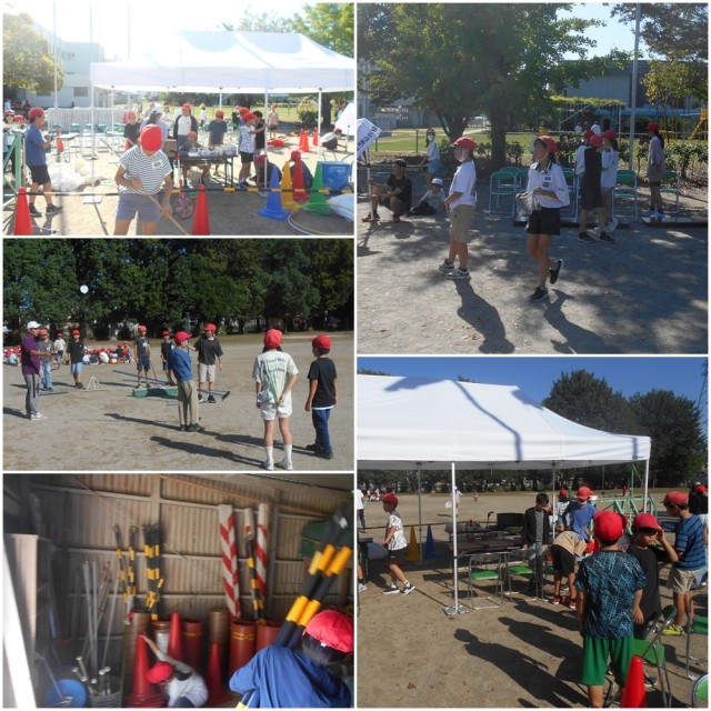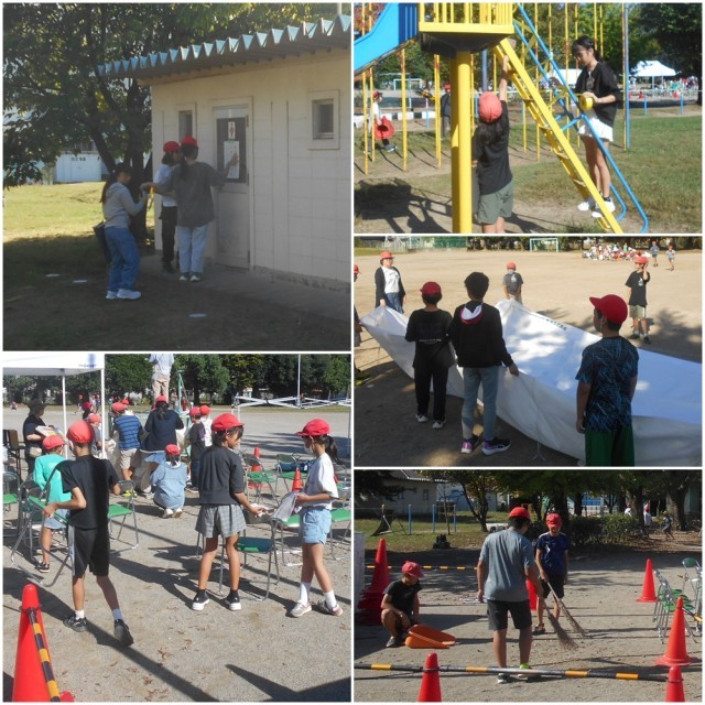 昨日予定していた準備を本日午後に延期して行いました。6年生児童を中心に役割ごとに分担し、机・いすを運んだり、遊具にテープを巻いたりしました。また、石拾いや草抜き、落ち葉拾いなども進んで行う姿が見られました。