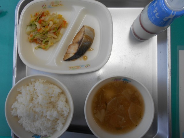ごはん ぎゅうにゅう ぶりのてりやき はくさいとえのきのおひたし かぶといももちのとろみじる エネルギー567kcal