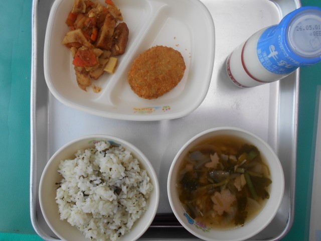 わかめごはん ぎゅうにゅう なのはなコロッケ たけのこのとさに はるのみかくじる エネルギー590kcal