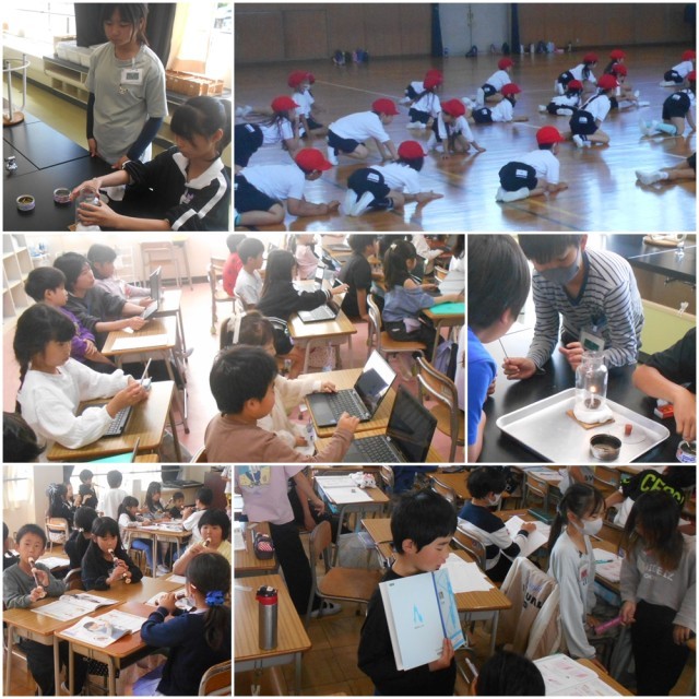 3年生図工「お気に入りの葉」では、お気に入りの葉を探して採集したあと、葉やつくった緑色を使い、葉の貼る位置や向き、色の組み合わせを工夫して表現していました。