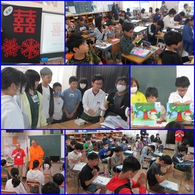 各国の紹介に続き、中国・タイでは「切り絵」と「紙芝居」、ブラジルでは「伝言ゲーム」を体験しました。子どもたちは異文化に触れ、笑顔でコミュニケーションを取りました。この経験が世界の広さを知り、国際的な視野を広げる有意義な一日となりました。