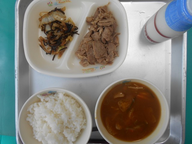 今日は食育の日で、江南市産の小松菜とさつまいもを使った献立です。小松菜は切り干し大根と一緒にさっぱり和えにし、さつまいもはみそ汁に入れました。地元の味を楽しみましょう。(藤の花給食センター「9月分献立表」より)