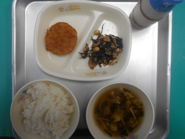 ごはん ぎゅうにゅう くりいりコロッケ だいずのいそに じゅうさんやじる  エネルギー649kcal