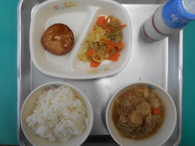ごはん ぎゅうにゅう やさいつくね じゃがいものそぼろに たくあんあえ エネルギー651kcal