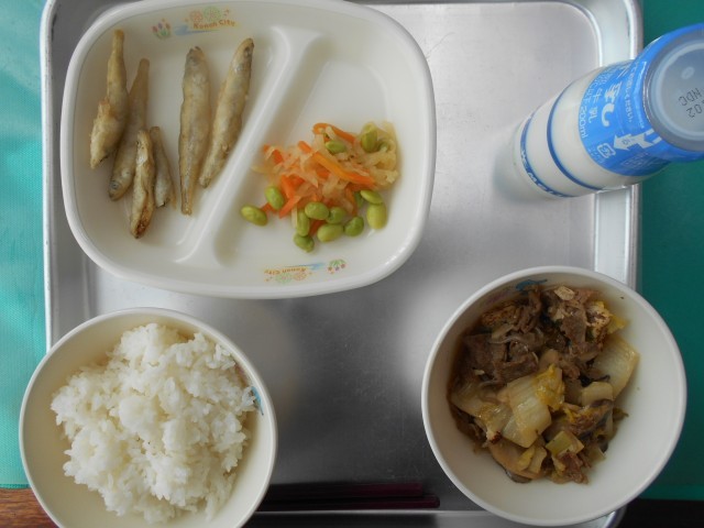 ごはん ぎゅうにゅう わかさぎのからあげ ぎゅうなべ だいこんサラダ  エネルギー638kcal